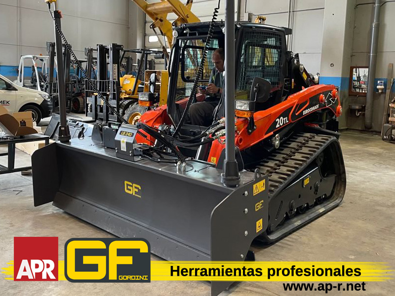 En este mes de septiembre procedemos a la preparación de hoja niveladora hidráulica GF GORDINI modelo LB 240, equipada con sistema de nivelado por láser. La hoja va montada en una cargadora compacta sobre cadenas EUROCOMACH, modelo TL 20 -5.500 kg. de peso operativo-.