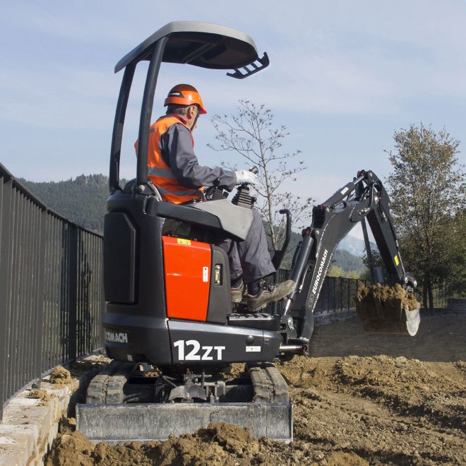 Compacta pero increíblemente estable, la 12ZT (giro cero con carro ensanchado) está diseñada para ofrecer un alto rendimiento en cualquier obra de construcción, sobre todo en interiores. La 12ZT no tiene saliente posterior, el contrapeso permanece dentro las dimensiones de las cadenas, permitiendo al operador trabajar en total tranquilidad incluso en espacios reducidos.