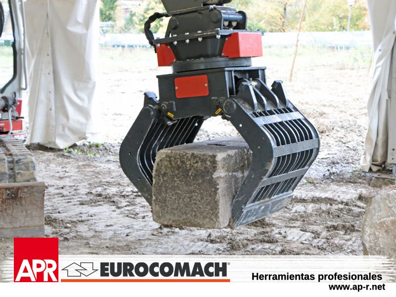 Eurocomach, fabricante Italiano de mini y midiexcavadoras desde 1 hasta 10 toneladas, y minicargadoras, dispone en su catálogo de implementos de una amplia gama de pinzas de escollera -o de selección-, para instalación en excavadoras desde 1 hasta 30 toneladas.