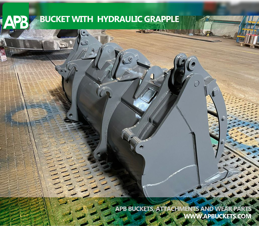 Una de las entregas de nuestro cazo con grapa hidráulica, en esta ocasión, con capacidad de 1,3 m3, para uso con pala cargadora Liebherr S18, en tareas de limpieza de playas.
